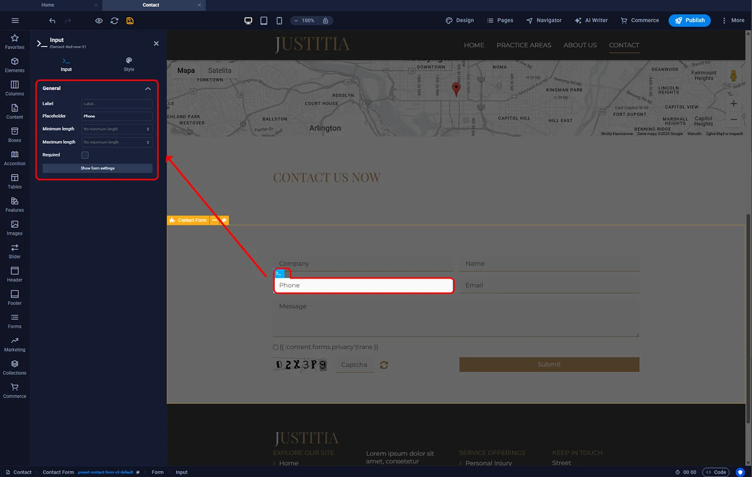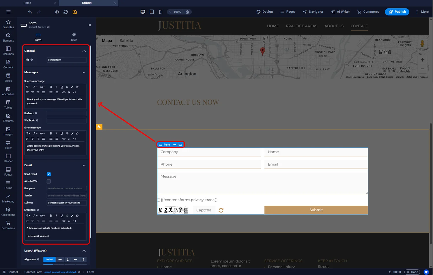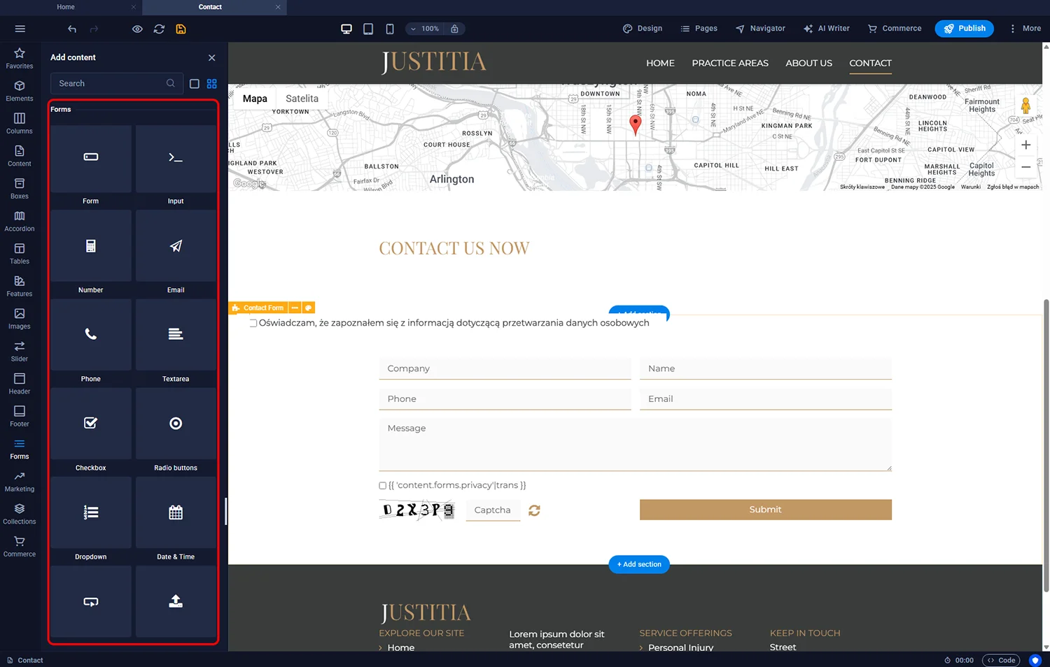 To place a contact form on the page, simply click the Forms icon visible in the left sidebar, then select the Contact Form element and drag it to the desired location on the page.