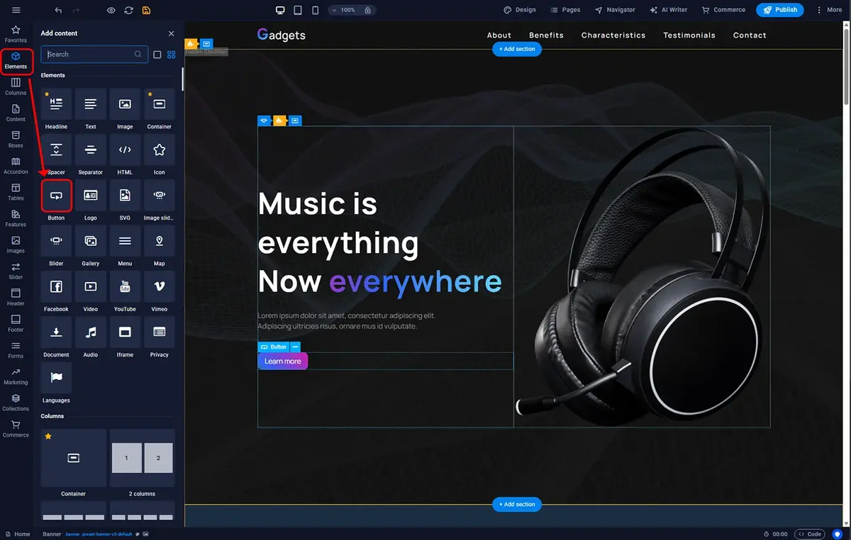 Buttons are important elements of a website that allow you to redirect the user to a specific location within the site or to an external page. To add such an element in the Sitejet Builder editor, click the Elements icon in the left sidebar, select Button, and drag it to the desired location on the page.