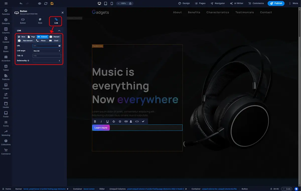 The final thing to configure is the link that the button will direct to. To set this, double-click the button element in the main editor window, then in the settings panel on the left sidebar, go to the Link tab. Here you can choose whether the button will link to another element on your page, an external resource, or to an email client to compose a message.