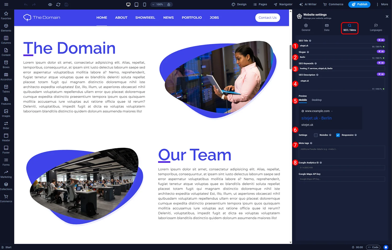 SEO settings determine how search engines "see" your website, and this translates into its position in search results. In this article, we will show you how to effectively manage SEO settings in the Sitejet Builder editor.
